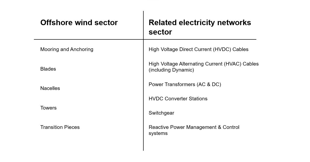 - The list of eligible components includes: mooring and anchoring, blades, nacelles, towers, monopiles, transition pieces, HVDC cables, HVAC cables (incl. Dynamic), power transformers (AC and DC), HVDC converter stations, switchgear, reactive power management and control systems.